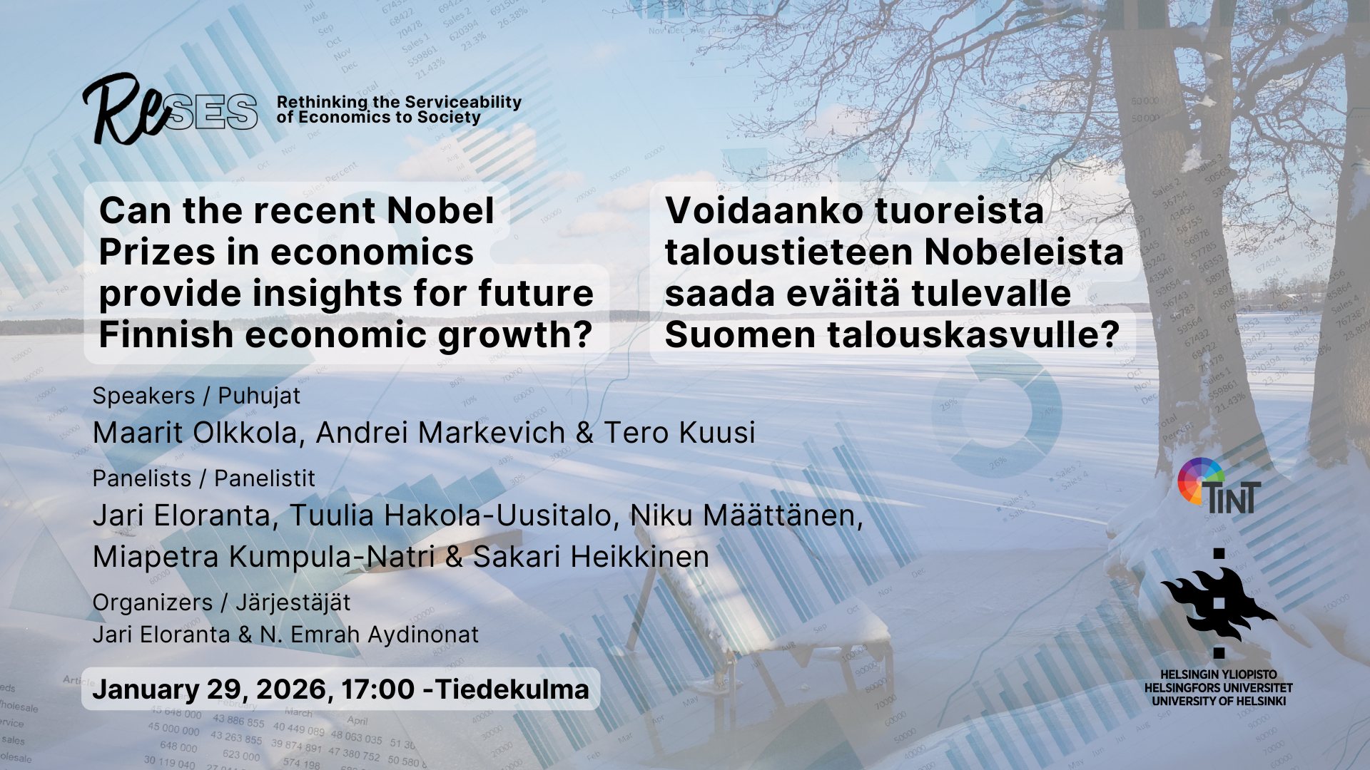 ReSES – Rethinking the serviceability of economics to society – organises events and seminars on economics and its role in the society. We bring together researchers and practitioners, who share an interest in understanding economics and its influence. Our target is to create constructive discussion on how economics affects the world around us in beneficial and harmful ways. The project received funding from the Finnish Cultural Foundation for 2023 and 2024. For more information, please visit our About page.