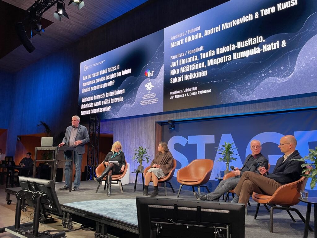 Panel: Jari Eloranta (chair), Miapetra Kumpula-Natri, Tuulia Hakola-Uusitalo, Sakari Heikkinen, and Niku Määttänen. Presentations by Maarit Olkkola (VATT), Andrei Markevich (University of Helsinki), and Tero Kuusi (ETLA).